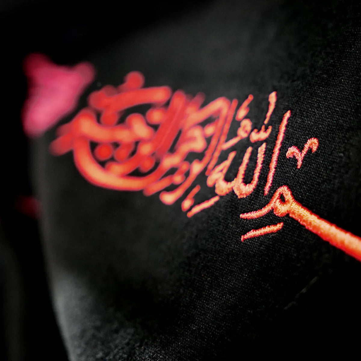 - The front is emblazoned with a fully embroidered red "بِسْمِ ٱللَّٰهِ" (Bismillah), an Uzi print on the right breast, and vertically embroidered "HTTPDAEMON" text.