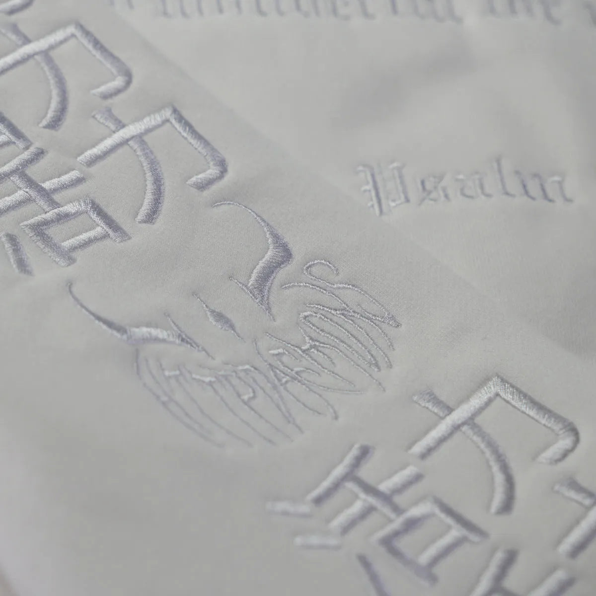 - The entire front features a large, intricate white-on-white embroidered prayer from Psalm 139:1-6.