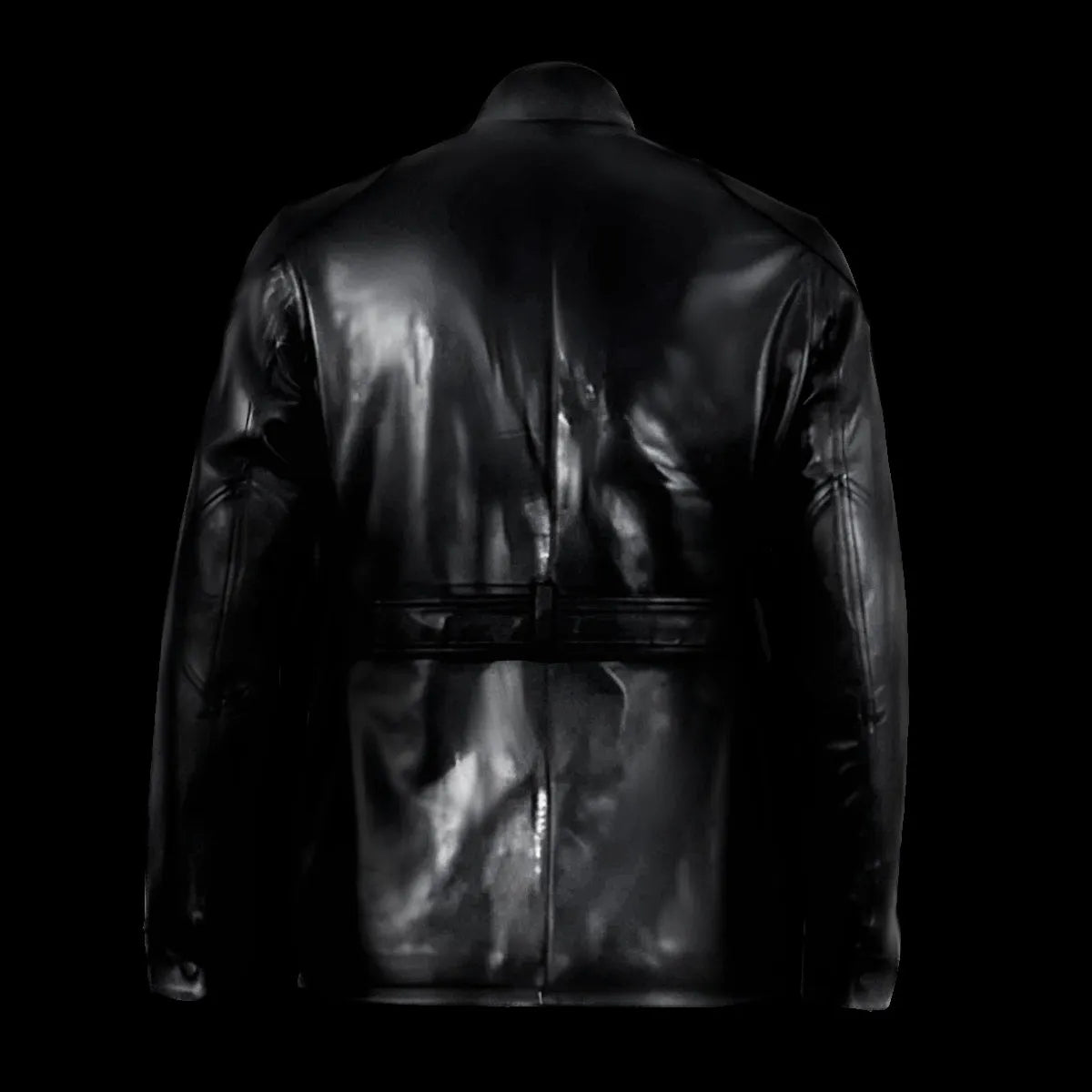 - Features a commanding silhouette with a full button closure, a matching leather belt to define the waist, and adjustable belted cuffs.