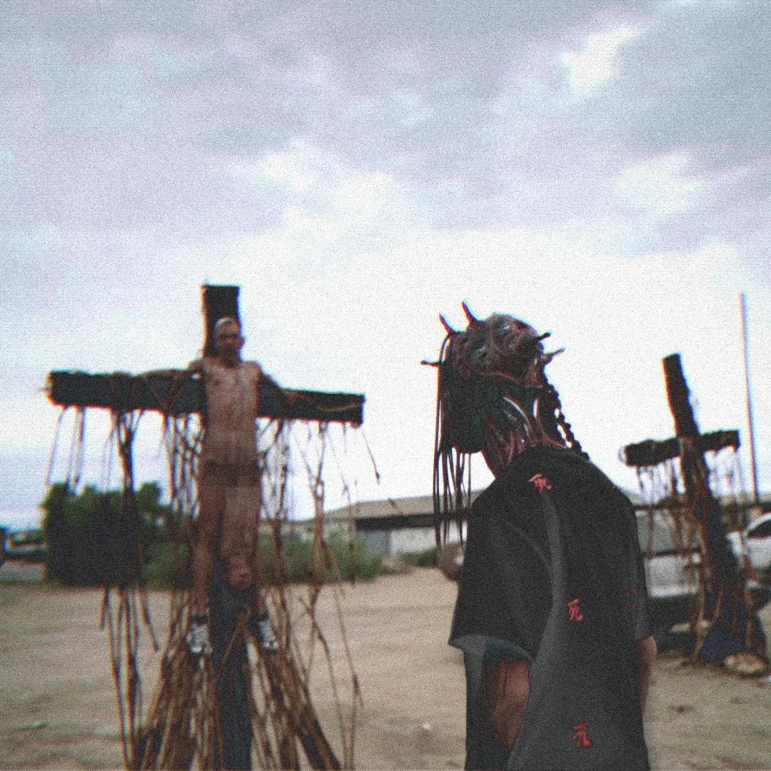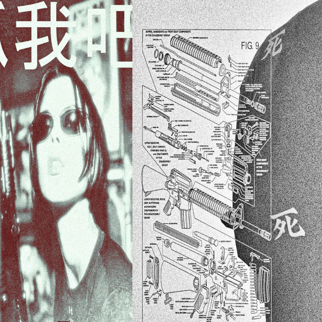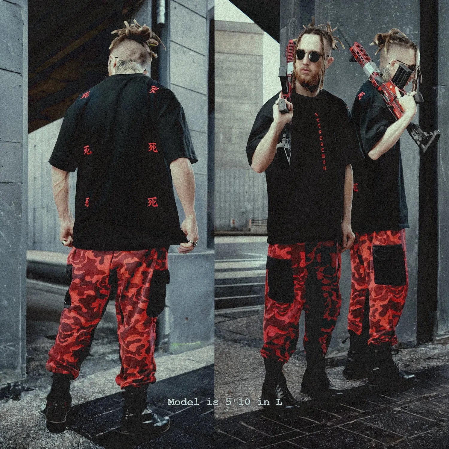 - The back displays six red embroidered emblems, each featuring the Chinese character for death "死".