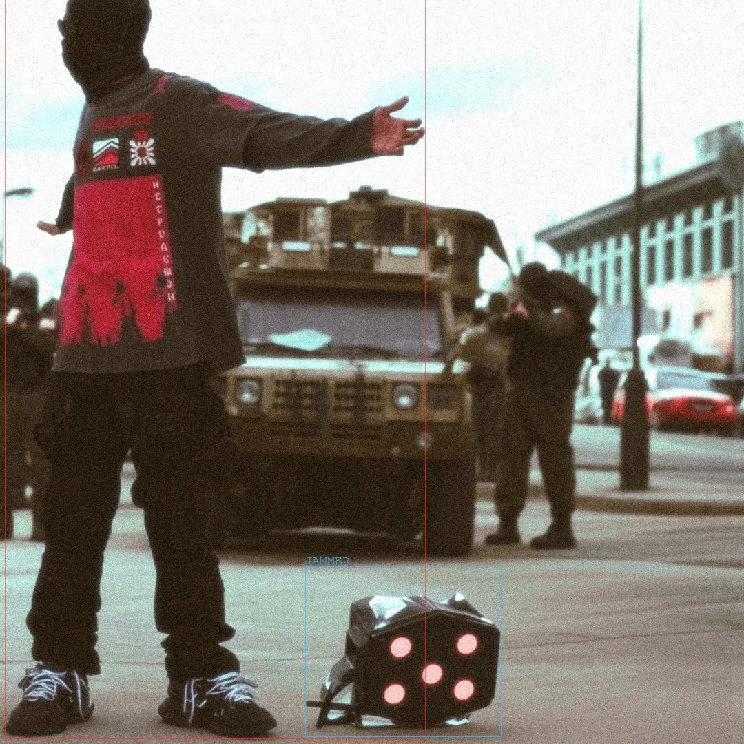 - The back is riddled with 23 embroidered bullet holes, each marked with a "-3HP" blood-red print over video game code.