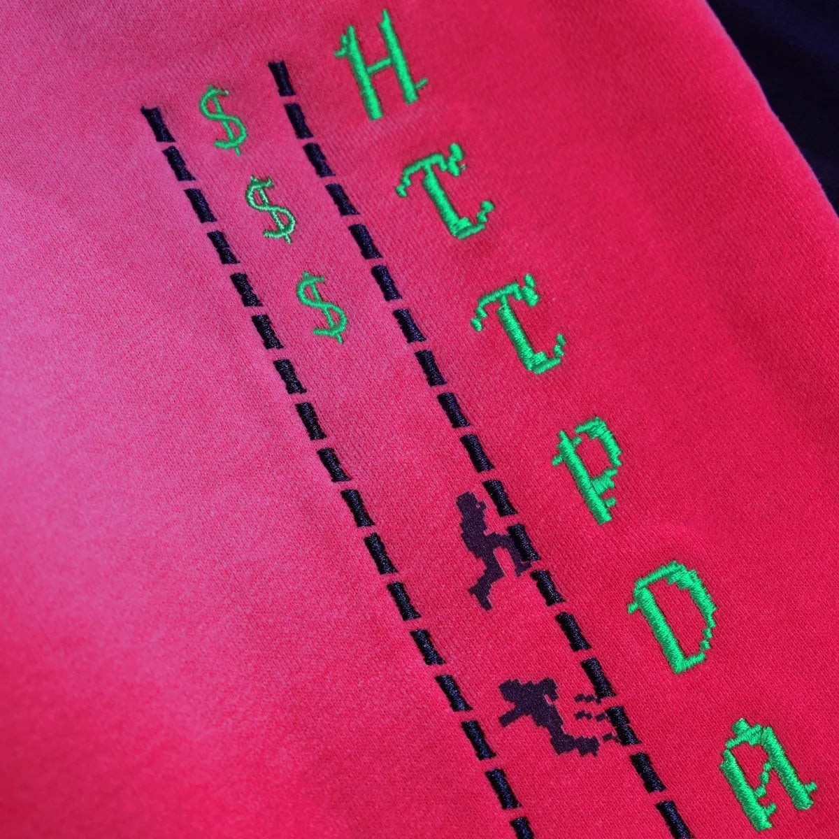 - Lime green accents, embroidered $ symbols, and the HTTPDaemons logo adorn the front, with "HTTPDAEMON" lettering flowing down the right pant leg.